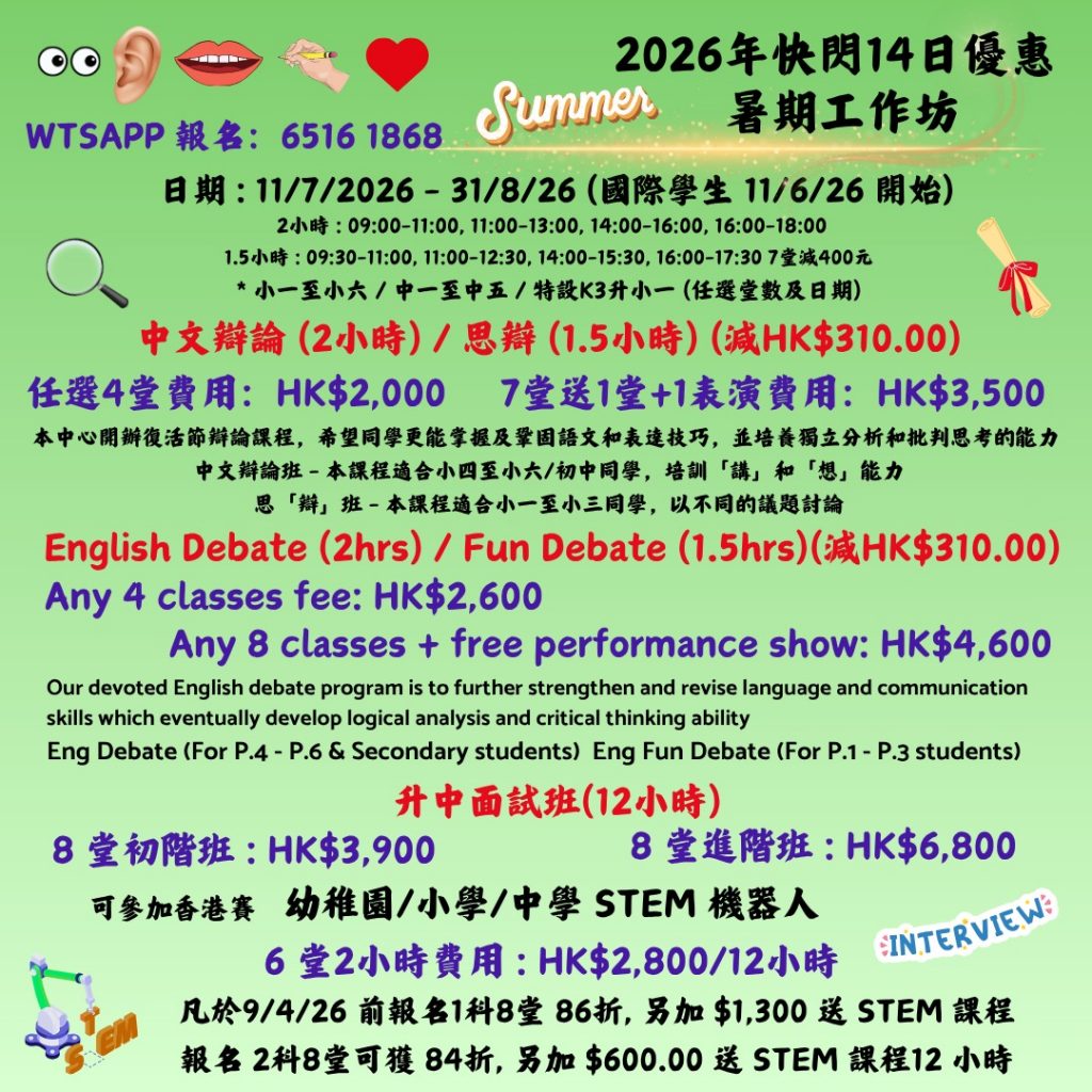 【2026年暑期課程快閃14日優惠 86折 】 優惠期至 4月9日!暑期七堂送一堂速成班📣